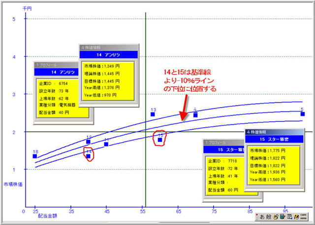 弊社の方式に拠る株価の回帰分析は、ビジュアルな画面と正確な計算で、買い付ける企業の選定には、特に威力を発揮します。
